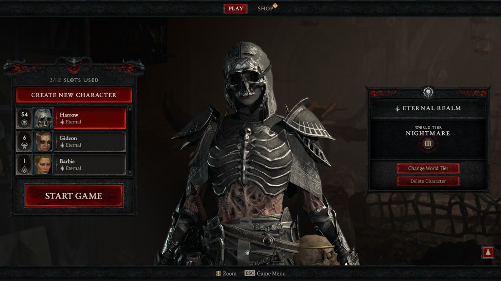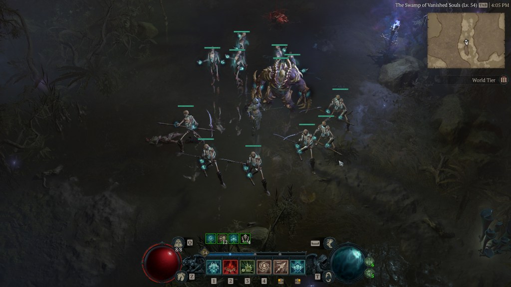 Speaking of endgame, this game sort of has one. Once I finished things in the campaign there were some post game side quests that unlocked endgame activities like Whispers of the Dead, which are bounties you can take on for a tree full of decapitated heads called the Tree of Whispers. I actually really like the Tree of Whispers, it's a neat weird thing, but said bounties generally involve roaming the over world and killing 100 creatures that spawn a little too sparsely or repeating a dungeon again. Once you have done enough of this, you return to the tree for a cache of items that so far for me, have not been significantly better than the unique or legendary items I have currently. Endgame content also consists of events called Helltides which involve a section of the map becoming overrun with demons, which you slaughter for little red crystals. Once you have enough little red crystals you can open chests in the Helltide area that will theoretically proffer you better loot, but if you die you lose a fair amount of little red crystals. Thus far I have only caught two Helltides and the jewelry I have received has been decidedly unfabulous and unhelpful. This is not to say no progress is made, even if the loot sucks your earning experience points which by this late in the game draw you closer to more paragon points. So you're always earning something, which feels nice, but I am less compelled to chase +.3% dexterity than I am something like a new exotic weapon or armor in Destiny, particularly when the aforementioned seasons that Diablo IV will have require you to make a whole new character each time a new season starts. I am not terribly compelled to incrementally increase endgame stats when I can't really chase new pursuits with said stats when the time comes. Diablo IV does not have raids, and the only other endgame content that I am currently aware of is PVP, nightmare dungeons, and increasing your world level. I am less than uninterested in PVP in a game like Diablo, and frankly I don't think it's a primary draw for the fanbase. Not unhappy it exists, but also entirely uninterested in trying to kill a druid named Porkbunzz with the title Corpse Trash for some currency to buy new pants with when I could do literally anything else. Nightmare dungeons are more challenging versions of dungeons you likely have already bested multiple times before with new modifiers to ideally make things more challenging, but so far from the few I've done on World Tier 3 I haven't noticed much of a difference. Speaking of World Tiers, they are something I really like! Think of them like game difficulties. You can start at Tier 1 (easiest) or Tier 2, and upon completing the campaign and doing some additional quests will unlock Tier 3. As tiers increase so will the gold you earn, the quality of the loot you earn, and ideally the challenge of the enemies. The game does a good job of recommending you to move on to new tiers, and I felt like the difficulty of each tier is balanced well. Also as a cool thematic touch, as you increase your world tier the statue of Inarius in Kyovashad becomes more corrupted and crawling with ichor and claws. I like it! I'm currently at world tier 3, and unfortunately world tier 4 (the highest as of the time of writing) only opens at level 70 which do I not feel compelled to reach.
