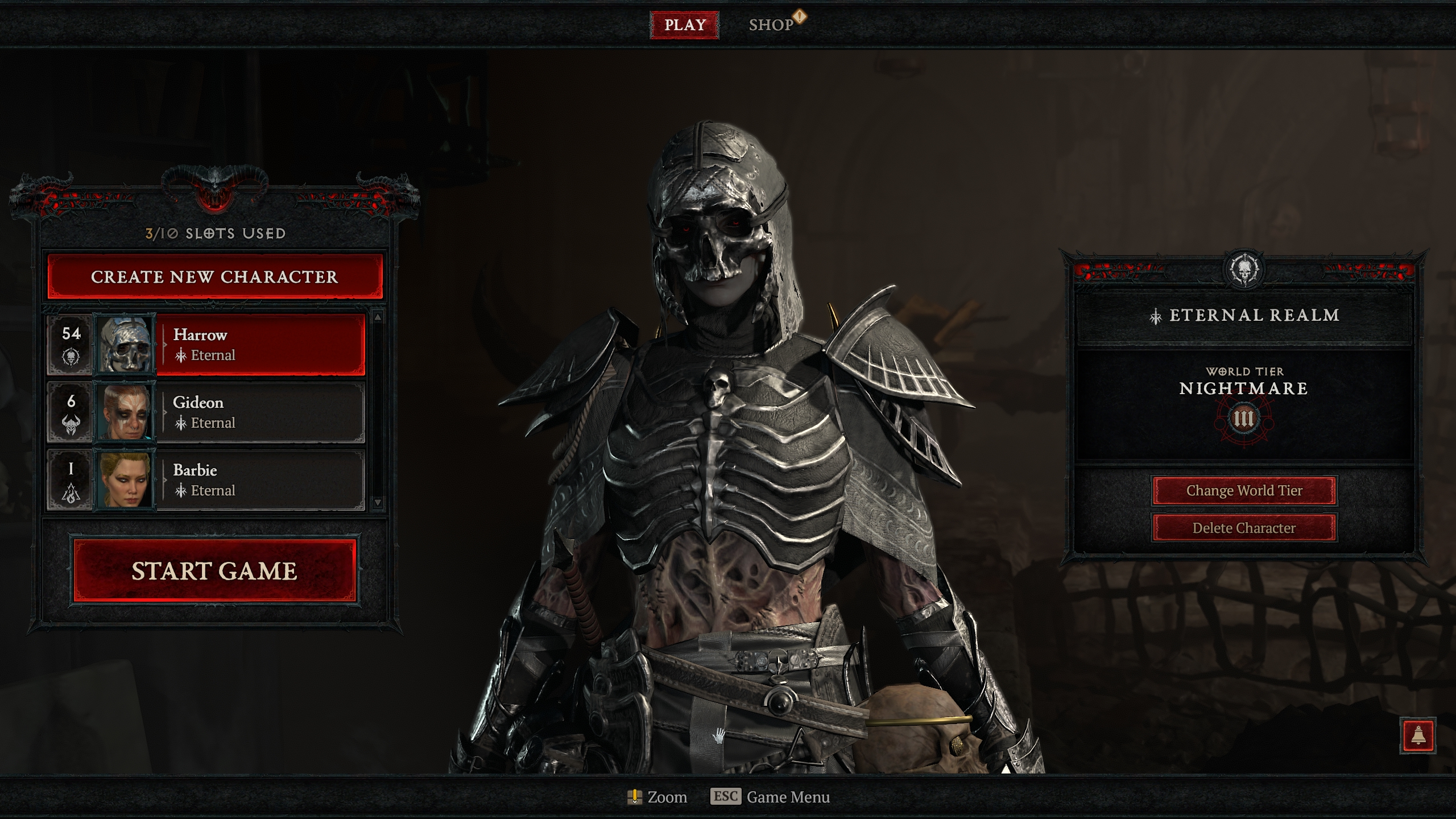 This does, however, also bring up a small gripe I have with the game, which is that I don't know how much of a benefit Diablo recieves from being an always online always multiplayer game. On one hand, you can't control how someone is going to engage with a game and how they might want to express themselves. On the other hand, it feels decidedly less goth and metal to come out of a dungeon or warp back to town and see a bunch of undressed players standing around the town portal with names like bigdude, QWERTY, LilithsToy, and other names that skirt the line between perverse and offensive. I like to try to take a world and story seriously and role play a little more than most, so maybe this is on me, but when your fire and blood world is covered in player jokes, it makes it harder to want to take Hell seriously. I didn't find interacting with other players necessary for forging ahead in the game anyways. I cleared campaign, dungeons, and so far all other manner of activity on my own with little struggle. There are world bosses present on the map that spawn every few hours that multiple players can and should tackle, and that's charming to complete as a goal and thank everyone with ingame emotes afterwards, but beyond that, I found little interaction with my fellow heroes. To be clear it isn't bad that I could do it all on my own, but this observation feels like more of what I've described: Diablo IV wants to live in purgatory. It doesn't want to have to choose which type of game to be and wants to have it all. It wants to let you play the game solo and never interact with anyone so that it doesn't scare you, but also wants to be just online enough so that you'll put some some money in the hat and buy a cosmetic or two. In doing this, it neither suceeds nor fails at either. It isn't bad to play alone, quite the opposite. But it isn't as immersive as it could be. It isn't bad to play with friends, but isn't challenging enough to require it from higher level play. Also given the isometric view of the world, the cosmetics feel nearly pointless, despite the cash shop constantly reminding you its there. For now, the cash shop is the friendly, anime-fied succubus in the room. Not particularly dangerous, and easy to ignore, but certainly present. Each over-priced armor or horse armor set as uninteresting as the last, and supposedly her sister, BattlePass, who is coming near the end of July; won't hurt you either because she's just cosmetics too. Don't worry, they're not like those other cash shops and battlepasses. Okay. But is anyone biting on these cosmetics that they can barely see? Doesn't a live game like Diablo now is need steady income? And I've seen what Diablo's sibling Overwatch has been up to. Forgive me if I lack faith.