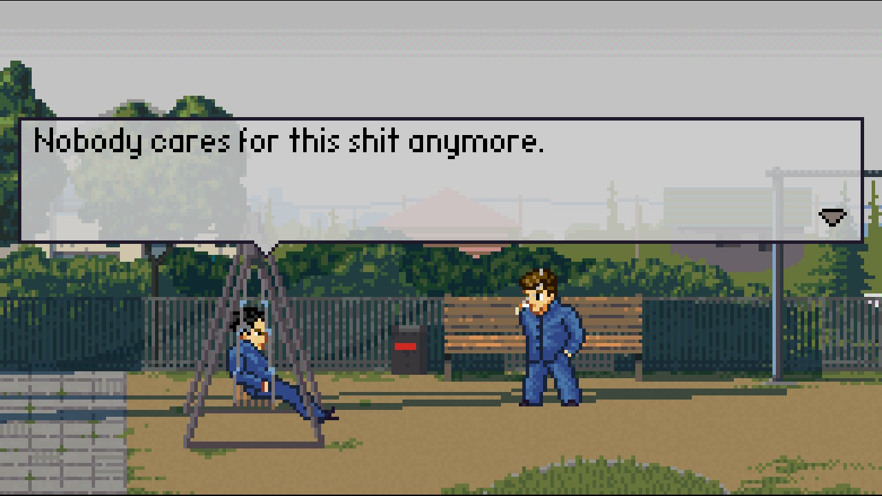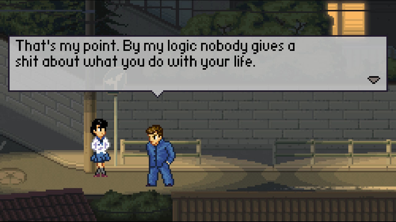Dialogue doesn’t always feel like the words a teenager or young adult would use, but more often than not the writing certainly captures the feeling and attitude of this tender and emotional time of life. Characters often don’t know what to say to each other, and many emotional or existential scenes result in some form of “damn man…. That sucks.” Sometimes, the game posits, that’s all there is to say. You’ve reached the butt of the cigarette and that’s all there is. No more.
